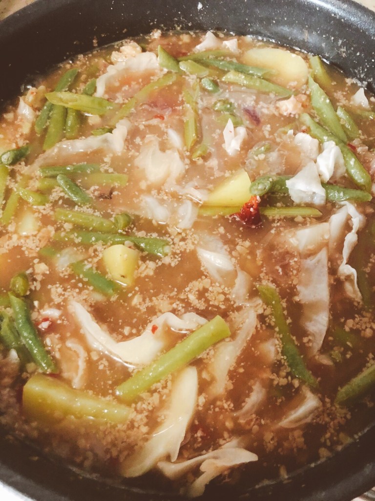 When a medley of vegetables are cooked in tamarind juice, that’s when you get Sayur Asam. Normally, corn is used but in the absence of 🌽, I use Long beans, cabbage and potatoes to complete my dish.
